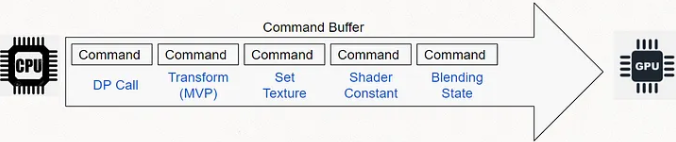 이 상태 정보를 CPU는 GPU에게 전달하고 GPU는 렌더 상태 정보를 저장한다. 마지막으로 CPU는 GPU에게 그리라고 명령하는데 이를 DP Call이라고 한다. 또한 CPU는 GPU에게 바로 명령을 하지 않고 Command 버퍼라는 곳에 명령 버퍼를 저장한다. 그러면 GPU는 할 일을 처리한 후에 Command 버퍼에서 명령을 순차적으로 가져가서 수행한다. (이때 FIFO 구조로 데이터를 불러온다)